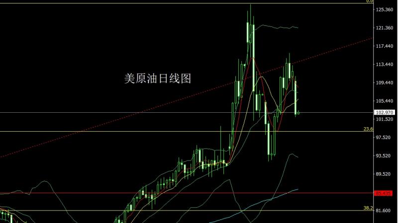 美原油市场昨日低开在109.734的位置后行情回补缺口给出110.911的位置后行情回落,日线最低给到了101.838的位置后行情整理,日线最终收线在了102.566的位置后日线以一根上影线很长的大阴线收线,而这样的形态收尾后,今日的行情106空止损107,下方目标看102和101-100,跌破的话看99.2.