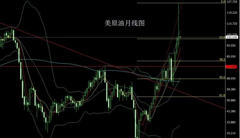 美原油市场3月初开盘在95.035的位置后行情先拉升给出月线高点126.65的位置后行情冲高回落,月线最低给到了92.1的位置后行情二次拉升,月线最终收线在了100.324的位置后行情以一根上影线极长的倒锤头形态收线,而这样的形态收尾后,4月的行情在俄乌冲突减缓以及美联储持续加息的背景下有看空需求,点位上,今日的行情103.25空止损104,下方目标看100和98.7和97.5.
