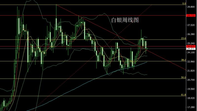 上周白银市场周初小幅高开在25.506的位置后行情小幅拉伸给出25.587的位置后行情回落,周线最低给到了23.94的位置后行情超跌整理,周线最终收线在了24.623的位置后行情以一根下影线很长的大阴线收线,而这样的形态收尾后,周线双阴夹阳,本周24.75空止损25,下方目标看24.4和24.1跌破看23.8支撑。