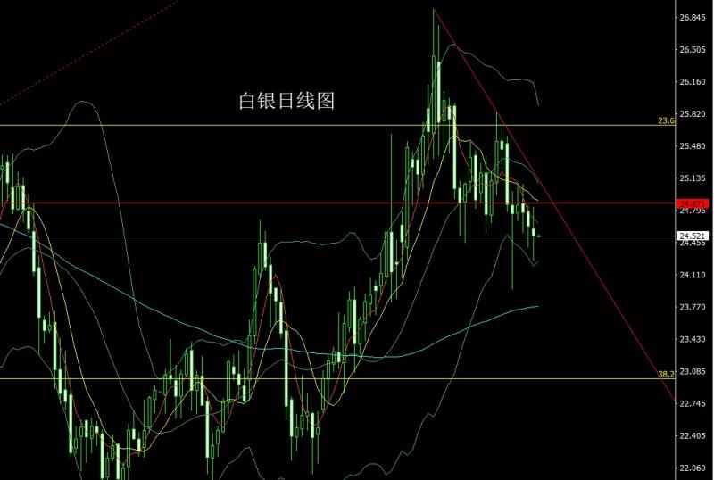 昨日白银市场早盘开盘在24.598的位置后行情先拉升给出24.835的位置后行情快速回落,日线最低给到了24.259的位置后行情整理,日线最终收线在了24.519的位置后行情以一根上下影线基本等长的纺锤形态收线,而这样的形态收尾后,今日的行情延续区间点位上,今日如果先拉升给出24.75空止损25,下方目标看24.4和24.3.
