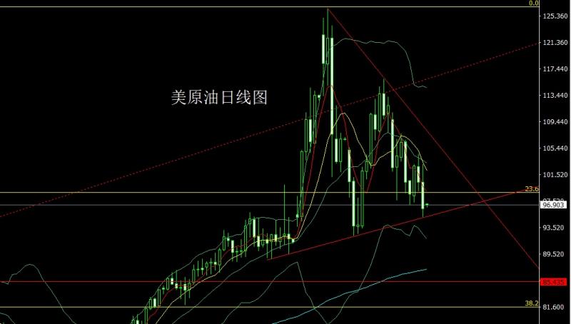 昨日美原油市场延续回落过程,早盘开盘在100.294的位置后行情先拉升给出102.995的位置后行情快速回落,日线最低给到了95.141的位置后行情受到本轮三角整理下轨支撑整理,日线最终收线在了96.344的位置后行情以一根上影线很长的大阴线收线,而这样的形态收尾后,日线跌破上周低点但下方触及支撑后今日行情会有震荡过程,点位上,昨日102-102.5的空减仓后止损跟进在102持有,今日的行情先拉升给出给出99.5空止损100.5,下方目标看97和95.15,跌破看94和92.3.