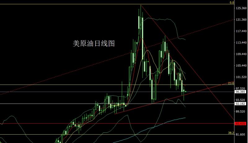 昨日美原油市场早盘开盘在97.074的位置后行情先回落给出94.809的位置后行情拉升,日线最高触及到了98.155的位置后行情展开回落过程,日线最低给到了93.334的位置后行情二次拉升,日线最终收线在了96.536的位置后行情以一根下影线极长的锤头形态收线,而这样的形态收尾后,日线初步得到支撑,点位上,102-102.5的空减仓后止损跟进在101持有,今日的行情如果先回落给出94.5多,止损93.5,目标看97.5和98.5-99压力。