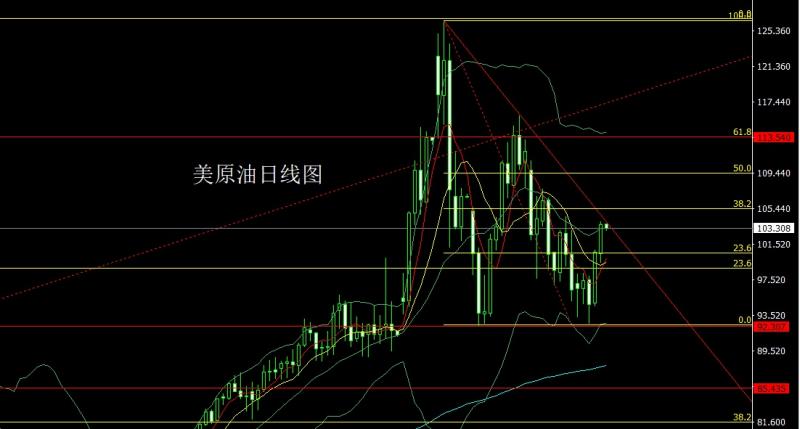 昨日美原油市场延续反弹过程,早盘行情开盘在100.418的位置后行情回踩99.426的位置后行情展开拉升过程日线最高触及到了104.008的位置后行情遇阻整理,日线最终收线在了103.663的位置后行情以一根下影线很长的大阳线收线,而这样的形态收尾后,今日的行情依旧要多,点位上,今日102.2多止损101.5,目标看104破位看104.3和104.8压力。