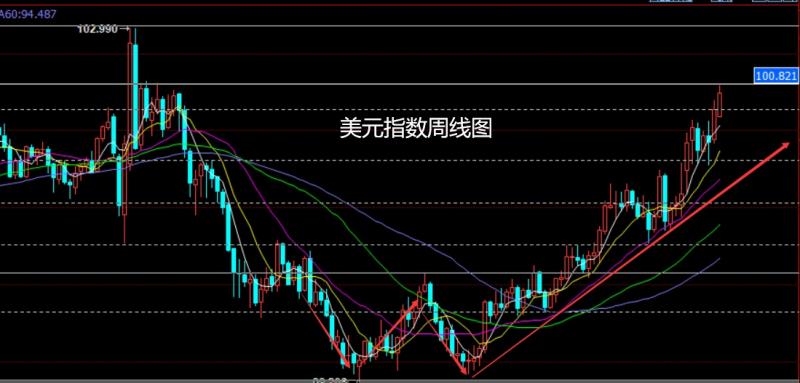上周美元指数市场周初低开在99.582的位置后行情直接拉升,周线最高触及到了100.76的位置后行情冲高回落,周线最终收线在了100.451的位置后行情以一根上影线很长的光脚大阳线收线,而这样的形态收尾后,周线破位压力,本周行情回踩后延续看多。