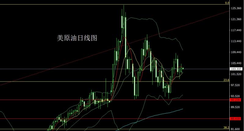 美原油市场早盘开盘在102.358的位置后行情小幅回踩给出101.815的位置后行情快速拉升,日线最高触及到了105.231的位置后行情快速回落,日线最终收线在了103.844的位置后行情以一根上影线很长的中阳线收线,而这样的形态收尾后,今日的行情区间操作,今日的行情如果先回落给出102.2多止损101.7,目标看103.5和104.3-105压力。