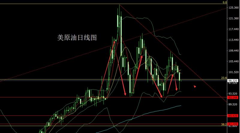 美原油市场昨日开盘在101.455的位置后行情直接回落,日线最低给到了95.008的位置后行情超跌反弹,日线最终收线在了98.346的位置后行情以一根下影线极长的大阴线收线,而这样的形态收尾后,今日的行情如果先回落给出97.3多止损96.6,目标看99.3和100-100.6压力离场反手空。