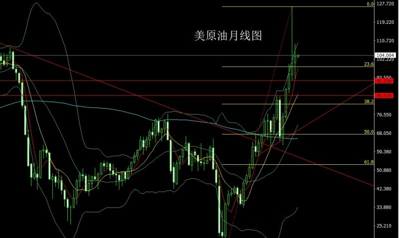 美原油市场上周完成四月构造,回顾行情,四月初行情开盘在100.519的位置后行情先回落,月线最低给到了92.514的位置后行情超跌反弹强势拉升,月线最高触及到了109.331的位置后行情整理,月线最终收线在了103.29的位置后,月线以一根下影线长于上影线的纺锤形态收线,而这样的形态收尾后,月线构建孕线区间波动,点位上,今日105.1空止损105.7,下方目标看102.65跌破看102和101.5,