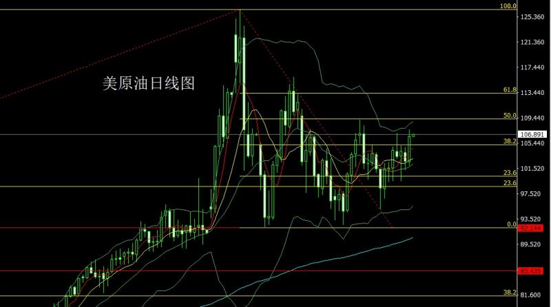 昨日美原油市场早盘开盘在102.519的位置后行情回踩101.974的位置后行情震荡拉升,日线最高触及到了107.624的位置后行情整理,日线最终收线在了106.520的位置后行情以一根上影线稍长于下影线的大阳线收线,而这样的形态收尾后,今日的行情短多后空,点位上,今日行情104.85多止损104.3,目标看107.6和108-108.6压力。