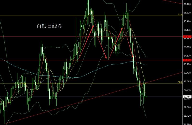 昨日白银市场早盘开盘在22.964的位置后行情先拉升给出23.262的位置后行情快速回落,日线最低给到了22.301的位置后行情整理,日线最终收线在了22.502的位置后行情以一根上影线稍长于下影线的大阴线收线,而这样的形态收尾后,日线阴包阳,今日的行情回踩做空,点位上,今日22.7空止损22.9,下方目标看22.3,跌破看22.1和21.8.