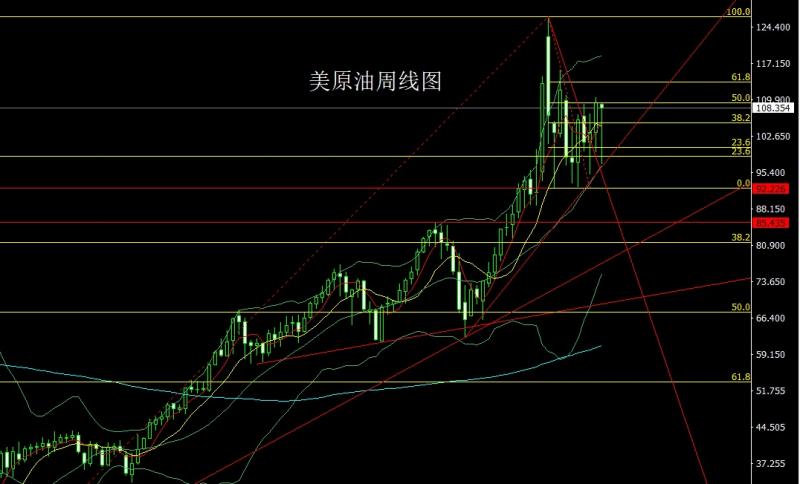 美原油市场上周开盘在109.025的位置后行情小幅拉升给出109.368的位置后行情快速回落,周线最低给到了97.1的位置后行情强势拉升,周线最终收线在了108.354的位置后行情以一根下影线极长的启明星形态收线,而这样的形态收尾后,周线在技术商有强烈看多需求,今日的行情回踩107多止损106.4,目标看109.4.破位看110.2和111