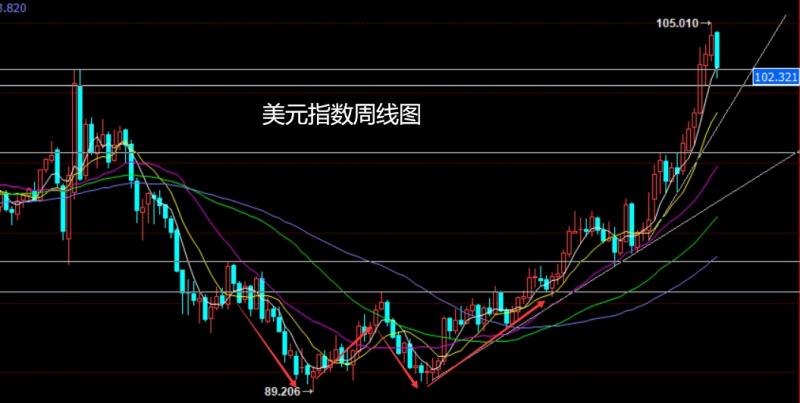 上周美元指数市场周初开盘在104.598的位置后行情小幅拉升给出104.66的位置后行情展开回落过程,周线最低给到了102.611的位置后行情整理,周线最终收线在了103.092的位置后行情以一根下影线很长的大阴线收线,而这样的形态收尾后,周线一阴包双阳,本周有继续回踩需求,但给出低点后行情有继续反弹过程。