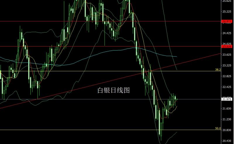 昨日白银市场早盘开盘在22.08的位置后行情小幅拉升给出22.135的位置后行情快速回落,日线最低给到了21.725的位置后行情尾盘拉升,日线最终收线在了21.968的位置后行情以一根孕线吊颈形态收线,而这样的形态收尾后,今日的行情22.1空止损22.3,下方目标看21.7和21.5-21.35.