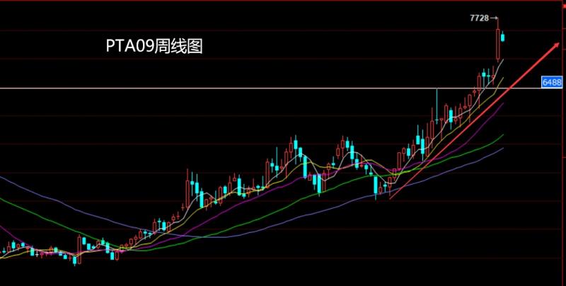 PTA09市场上周高开在7006的位置后行情回踩6932的位置后行情强势拉升,周线最高触及到了7728的位置后行情冲高回落,周线最终收线在了7320的位置后行情以一根上影线极长的中阴线收线,而这样的形态收尾后,本周7435空止损7460下方目标看7250和7150-7000.