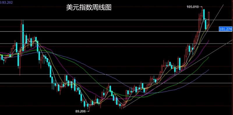 美元指数市场上周开盘在102.175的位置后行情先回落给出101.822的位置后行情受到欧洲央行表态不及预期以及美国通胀预期的影响行情强势拉升,到周五CPI爆表后行情最高触及到了104.23的位置后行情整理,周线最终收线在了104.199的位置后行情以一根下影线很长的大阳线收线,而这样的形态收尾后,下周美指将冲击前期高点。