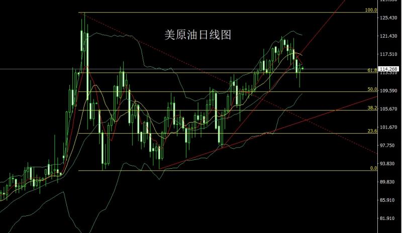 昨日美原油市场早盘开盘在113.61的位置后行情先拉升给出14.553的位置后行情延续前日的回落压力下行,日线最低给到了110.261的位置后行情在凌晨受到基本面刺激强势拉升,日线最高触及到了115.591的位置后行情冲高整理,日线最终收线在了114.428的位置后行情以一根下影线极长的锤头形态收线,而这样的形态收尾后,今日的行情有技术反弹需求,点位上,今日112.2多止损111.5,目标看114.5和115.59.破位看116.35和117,今日给出117空,止损117.5.目标看115和114.
