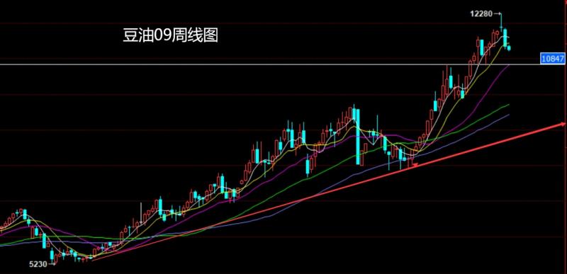 豆油09市场上周低开在11825的位置后行情回踩11859的位置后行情展开回落,周线最低给到了11216的位置后行情整理,周线最终收线在了11254的位置后行情以一根饱和大阴线收线,而这样的形态收尾后,本周11450空止损11650,下方目标看11000.跌破看11800支撑点。