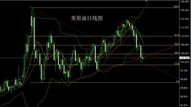 昨日美原油市场早盘开盘在103.8的位置后行情先回落,日线最低给到了101.688的位置后行情强势反弹,日线最高触及到了106.476的位置后行情冲高回落,日线最终收线在了103.284的位置后行情以一根上影线很长的纺锤形态收线,而这样的形态收尾后,今日的行情延续做空,点位上,昨日106.4的空减仓后止损跟进在106持有,今日的行情105.3空止损105.9下方目标看103和102-101.6,跌破的话看 101和100.3支撑点。