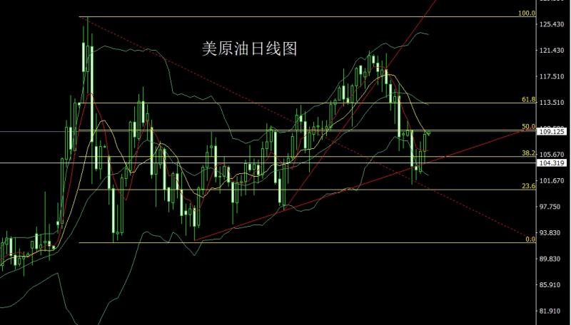 昨日美原油市场早盘开盘在106.110的位置后行情快速回落,日线最低给到了104.36的位置后行情得到支撑强势拉升,日线最高触及到了109.378的位置后行情遇阻整理,日线最终收线在了108.652的位置后行情以一根下影线很长的大阳线收线,而这样的形态收尾后,今日的行情延续做多,点位上,昨日104.6的多减仓后止损跟进在105持有,今日的行情107多止损106.5,目标看109.4.破位看110.8压力如果破位那么行情将冲击113压力离场反手空,如果不破那么这里将构建头肩底肩部构造,