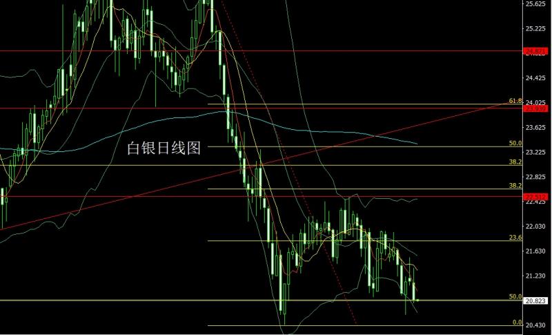 昨日白银市场延续回落过程,早盘开盘在21.116的位置后行情先拉升给出21.355的位置后行情展开回落,日线最低给到了20.783的位置后行情整理,日线最终收线在了20.833的位置后行情以一根上影线很长的大阴线收线,而这样的形态收尾后,今日的行情延续空,点位上,今日的行情21.1空止损21.3,下方目标看20.75,跌破看20.55和20.4支撑。