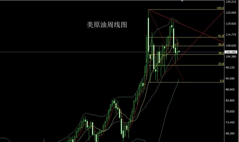 美原油市场上周开盘在106.062的位置后行情先回踩给出104.36的位置后行情拉升,周线最高触及到了112.713的位置后行情快速回落,周线最低给到了102.974的位置后行情整理,周线最终收线在了106.704的位置后行情以一根上影线极长的射击之星形态收线,而这样的形态收尾后,今日的行情105多止损104.5,目标看107.65和108.6和109.3压力。
