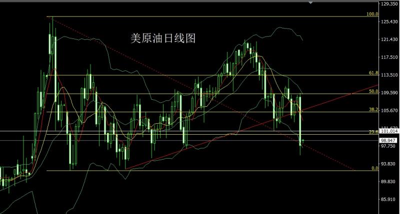 昨日美原油市场早盘开盘在108.593的位置后行情小幅拉升给出1.09558的位置后行情承压强势回落跌破前期低点后最低给到了95.627的位置后行情整理,日线最终收线在了97.815的位置后行情以一根下影线很长的大阴线收线,而这样的形态收尾后,日线完成N字破位,今日的行情高开后回踩颈线依旧要空,点位上,今日102空止损103,下方目标看97和95.6,跌破看94.5和93.2-92.5这个区间。