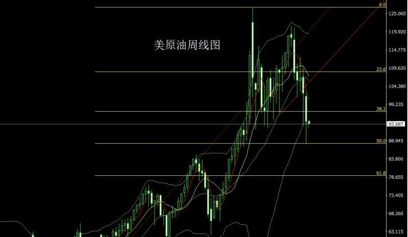 上周美原油市场周初小幅低开在101.543的位置后行情小幅回补给出102.622的位置后后行情强势回落,周线最低给到了88.227的位置后行情得到支撑强势反弹,周线最终收线在了94.408的位置后行情以一根下影线极长的大阴线收线,而这样的形态收尾后,本周91.5多止损90.8,目标看96和7压力。