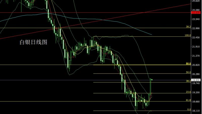 昨日白银市场早盘开盘在19.085的位置后行情回踩19.045的位置后行情震荡拉升,日线最高触及到了20.018的位置后行情整理,日线最终收线在了20的位置后行情以一根略带影线的饱和大阳线收线,而这样的形态收尾后,今日的行情延续多, 点位上,今日的行情19.6多止损19.4,目标看20.1和20.2-20.4。