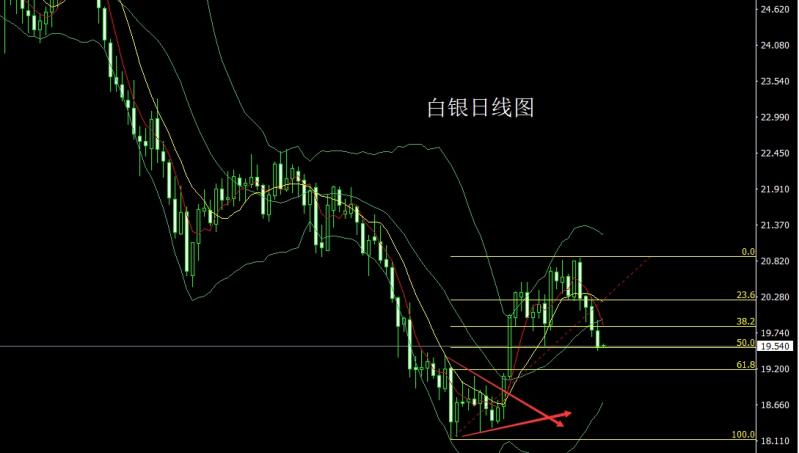 白银市场昨日开盘在19.775的位置后行情先回落给出19.596的位置后行情快速拉升,日线最高触及到了19.936的位置后行情美盘盘中回落,日线最低给到了19.47的位置后行情整理,日线最终收线在了19.533的位置后行情以一根上影线很长的大阴线收线,而这样的形态收尾后,今日的行情19.7空止损19.9下方目标看19.4和19.2支撑点离场准备多