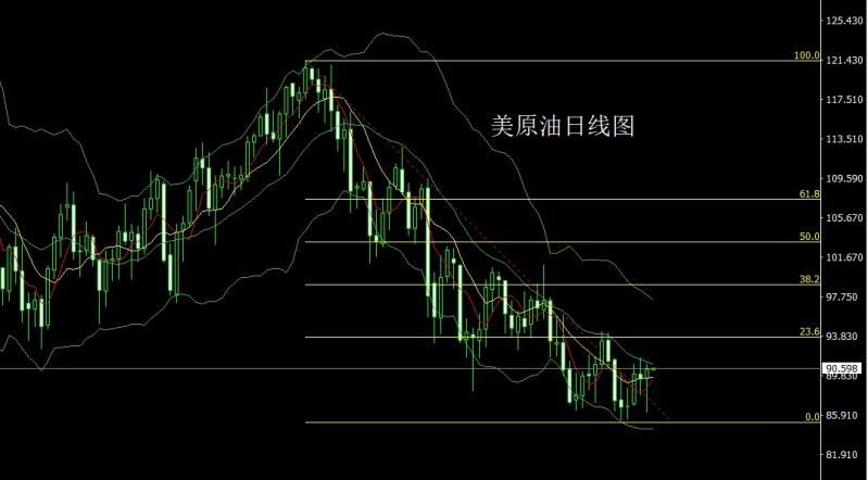 美原油市场昨日开盘在89.581的位置后行情先回落给出88.26的位置后行情拉升,日线高触及到了90.988的位置后行情在美盘快速下行,日线最低给到了86.205的位置后行情二次拉升,日线最终收线在了90.449的位置后行情以一根下影线极长的锤头形态收线,而这样的形态收尾后,近日的行情回踩还需多,点位上,今日的行情89.5多止损89.,目标看91和92-92.7.
