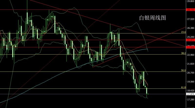 上周白银市场周初开盘在18.765的位置后行情小幅拉升给出18.91的位置后行情受到基本面影响震荡回落,周线最低给到了17.54的位置后行情整理,周线最终收线在了18.04的位置后行情以一根下影线很长的大阴线收线而这样的形态收尾后,本周如果先回落17.8多止损17.6,目标看18.3和18.5.