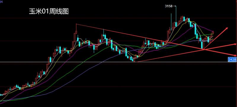 玉米01市场上周开盘在2802的位置后行情先拉升给出2831的位置后行情回落,周线最低给到了2785的位置后行情拉升,周线最终收线在了2817的位置后行情以一根下影线稍长于上影线的小阳线收线,而这样的形态收尾后,本周2800多止损2780,目标看2835和2855-2875.