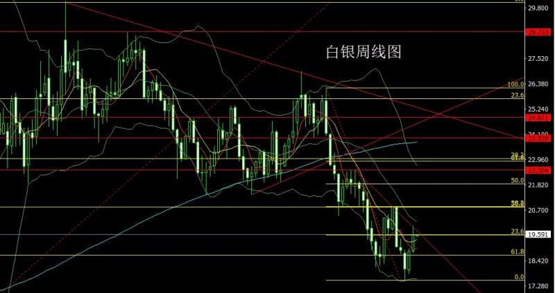 上周白银市场周初开盘在18.856的位置后行情先拉升,周线最高触及到了20.007的位置后行情震荡回落,到周五周线最低给到了18.765的位置后尾盘强势拉升,周线最终收线在了19.593的位置后行情以一根上影线很长的大阳线收线,而这样的形态收尾后,周线有继续反弹需求,点位上,今日19.25多止损19.05,目标看19.8和20-20.2.
