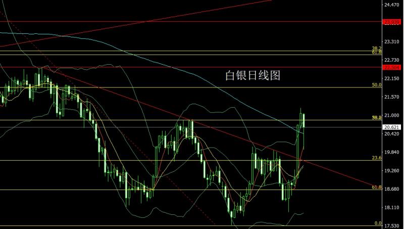 白银市场昨日宽幅波动,早盘开盘在21.033的位置后行情小幅拉伸给出21.062的位置后行情回落,日线最低给到了19.92的位置后行情强势拉升,日线最终收线在了20.621的位置后行情以一根下影线极长的锤头形态收线,而这样的形态收尾后,日线获利了结回踩结束,今日的行情延续做多,点位上,上周18.6的多减仓后止损跟进在19持有,今日的行情20.15多止损19.85,目标看20.8和21.2压力。
