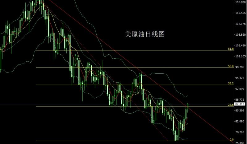 昨日美原油市场早盘开盘在85.786的位置后行情先回落,日线最低给到了84.789的位置后行情强势拉升,日线最高触及到了87.787的位置后行情整理,日线最终收线在了87.405的位置后行情以一根下影线很长的大阳线收线,而这样的形态收尾后,日线有效破位本轮下行趋势线,今日的行情回踩延续多,点位上,上周76.6附近的多减仓后止损跟进在79持有,今日的行情86.3多止损85.8,目标看87.8.破位看88.7和89.5。