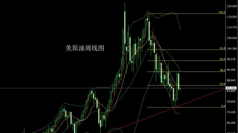 美原油市场上周开盘在92.26的位置后行情小幅拉升给出92.659的位置后行情一路震荡回落,周线最低给到了84.193的位置后行情整理,周线最终收线在了84.619的位置后行情以一根上下影线较长的大阴线收线,而这样的形态收尾后,本周如果先拉升给出86.6空止损87.1,下方目标看84.25,跌破看83.5和83-82.7这个区间离场反手多。
