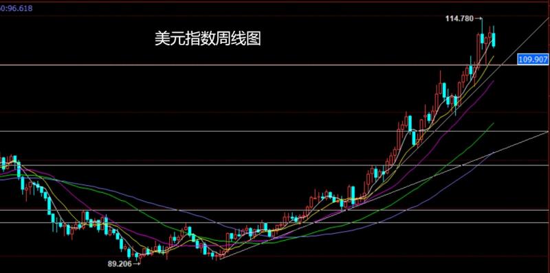 上周美元指数市场冲高回落,周初行情开盘在113.221的位置后行情先回落给出111.721的位置后行情强势拉升,周线最高触及到了113.97的位置后行情尾盘冲高回落,周线最低给到了111.680的位置后行情整理,周线最终收线在了111.891的位置后行情以一根上影线很长的大阴线收线,而这样的形态收尾后,周线阴包阳回落信号,下周的行情有继续下行过程。