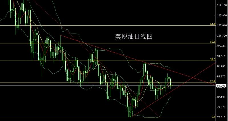 昨日美原油市场早盘开盘在87.707的位置后行情小幅拉升给出87.945的位置后行情展开回落,日线最低给到了84.744的位置后行情整理,日线最终收线在了85.673的位置后行情以一根下影线较长的大阴线收线,而这样的形态收尾后,今日的行情86.7空止损87.3下方目标看85.2和84.7,跌破看84整数关口支撑。