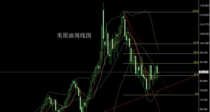 美原油市场上周开盘在91.824的位置后行情小幅拉升给出92.925的位置后行情回落,周线最低给到了83.998的位置后行情尾盘快速拉升,周线最终收线在了88.206的位置后行情以一根下影线很长的中阴线收线,而这样的形态收尾后,周线有探底反弹需求,点位上,今日88.25多止损87.7,目标看89.4和90.2和91-91.5.