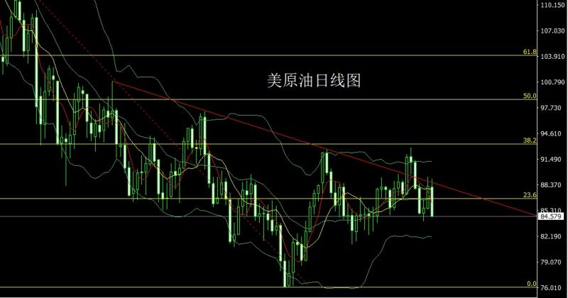 美原油市场昨日大幅回落早盘开盘在88.861的位置后行情先拉升给出89.081的位置后行情展开回落,日线最低给到了84.554的位置后行情整理,日线最终收线在了84.579的位置后行情以一根上影线很长的大阴线收线,而这样的形态收尾后,日线阴包阳,今日的行情如果先拉升给出86.2空止损86.7,下方目标看84.5,跌破看84和83.5-83.2.