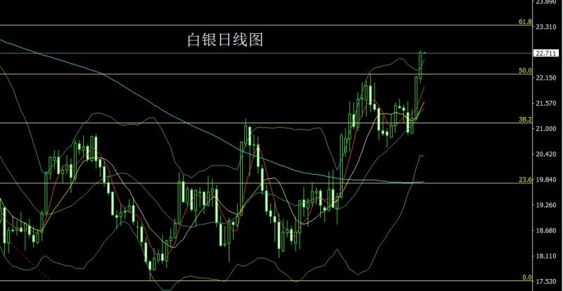 昨日白银市场早盘开盘在22.139的位置后先拉升给出22.4的位置后行情快速回落,日线最低给到了22.02的位置后行情强势拉升,日线最高触及到了22.773的位置后行情整理,日线最终收线在了22.725的位置后行情以一根下影线稍长于上影线的大阳线收线,而这样的形态收尾后,日线有效破位压力,今日的行情延续多,点位上,今日的行情22.4多止损22.2,目标看22.8.破位看23和23.3-23.5.