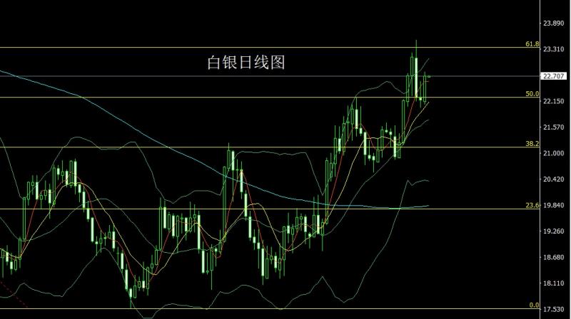 白银市场昨日早盘低开在22.129的位置后行情先回落给出22.071的位置后行情强势拉升,日线最高触及到了22.808的位置后行情整理,日线最终收线在了22.698的位置后行情以一根上下影线基本等长的大阳线收线,而这样的形态收尾后,今日的行情延续多,点位上,今日的行情22.5多,止损22.3,目标看22.85.破位看23和23.3-23.5.