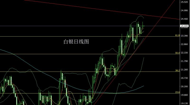 昨日白银市场早盘高开在23.83的位置后行情回补缺口给出23.769的位置后行情快速拉升,日线最高触及到了24.279的位置后行情整理,日线最终收线在了24.031的位置后行情以一根上影线很长的中阳线收线,而这样的形态收尾后,今日的行情23.8多止损23.6,目标看24.3和24.55-24.8.