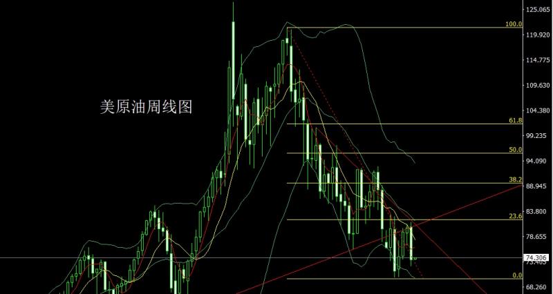美原油市场早盘开盘在80.608的位置后行情小幅拉升给出81.575的位置后行情强势回落。周线最低给到了72.554的位置后行情整理,周线最终收线在了73.835的位置后行情以一根下影线稍长于上影线的大阴线收线,而这样的形态收尾后,本周回踩75.2空止损75.7,下方目标看73.35,跌破看72.8和72附近离场准备多单