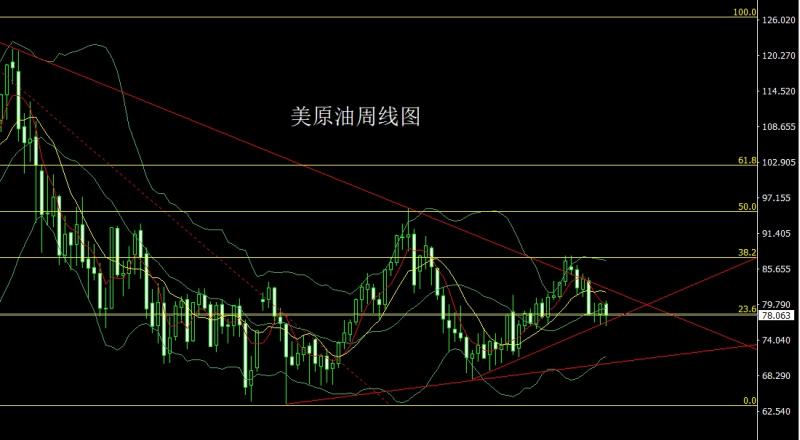 美原油市场上周开盘在79.92的位置后行情小幅拉升给出80.51的位置后行情承压回落,周线最低给到了76.45的位置后行情区间整理,周线最终收线在了78.06的位置后周线以一根下影线很长的中阴线收线,而这样的形态收尾后,本周如果先回落77.3多止损76.8,目标看78.2和78.6-79压力。