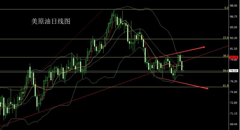 美原油市场昨日开盘在79.54的位置后行情小幅拉升给出79.64的位置后行情震荡回落,日线最低给到了77.85的位置后行情整理,日线最终收线在了78.11的位置后行情以一根下影线稍长的大阴线收线,而这样的形态收尾后,今日的行情有回落压力,点位上,今日的行情如果先拉升给出78.8空止损79.3,下方目标看77.85,跌破看77.2和76.85离场准备多。