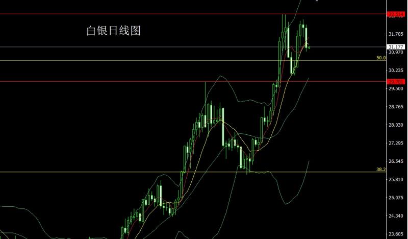白银市场昨日开盘在31.94的位置后行情小幅拉升给出32.091的位置后行情震荡回落,日线最低给到了30.991的位置后行情整理,日线最终收线在了31.148的位置后行情以一根上下影线等长的大阴线收线,而这样的形态收尾后,今日的行情有延续回落压力,点位上,下方22.35和22.5的多以及24.45的多减仓后止损跟进在27持有,今日的行情31.6空止损31.75,下方目标看30.95和30.7离场准备多。