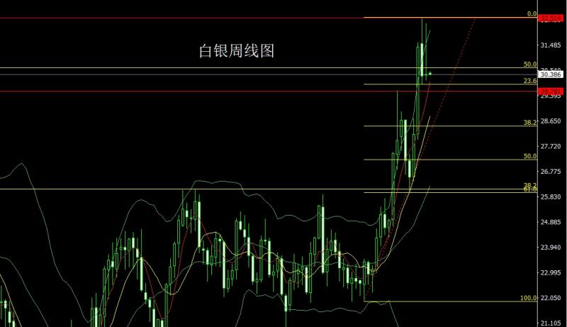 白银市场上周开盘在30.358的位置后行情强势拉升,周线最高触及到了32.306的位置后行情尾盘强势回落,周线最低给到了30.15的位置后行情整理,周线最终收线在了30.4的位置后,周线以一根上影线极长的射击之星周线收线,而这样的形态收尾后,周线锤星压力组合,本周市场延续高空,点位上,下方22.35和22.5的多以及24.45的多减仓后止损跟进在27持有,上周五31.6的空减仓后止损跟进在31.5持有,今日的行情30.9空止损31.1,下方目标看30支撑,跌破的话看29.7和29.329支撑。