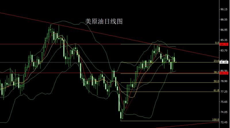 昨日美原油市场早盘开盘在82.68的位置后行情先拉升,日线最高触及到了83.34的位置后行情快速回落,日线最低给到了81.66的位置后行情宽幅震荡,日线最收线在了81.92的位置后行情以一根上影线很长的中阴线收线,而这样的形态收尾后,今日的行情82.5空止损83,目标看81.65和81.2和80.7.