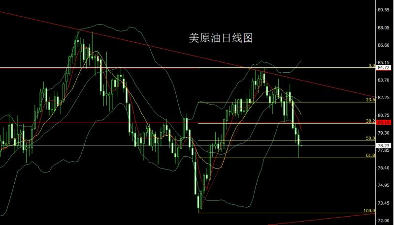 美原油市场昨日开盘在79.12的位置后行情小幅拉升给出79.6的位置后行情回落,日线最低给到了77.25的位置后行情收到本轮上行斐波那契的最后支撑61.8的位置拉升,日线最终收线在了78.33的位置后行情以一根下影线长于上影线的中阴线收线,而这样的形态收尾后,今日的行情77.6多止损77目标看78.5和79和79.6.