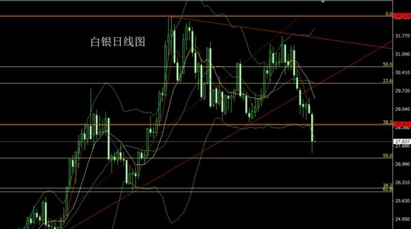 白银市场昨日开盘在28.861的位置后行情小幅拉升给出28.917的位置后行情回落,日线最低给到了27.397的位置后行情整理,日线最终收线在了27.843的位置后行情以一根下影线很长的大阴线收线,而这样的形态收尾后,日线有效破位支撑和颈线关口,今日的行情在技术上有继续回落压力,点位上,下方22.35和22.5的多以及24.45的多减仓后止损跟进在27持有,今日的行情早盘如果直接回落27.25多止损27.05,目标看27.9和28.2-28.4压力。